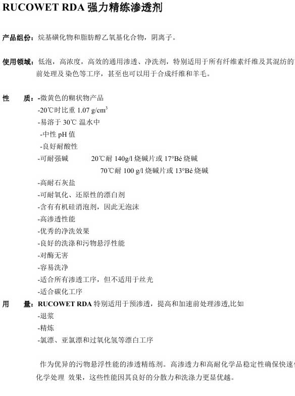 RUCOGEN FWK Refining DetergentProduct Components: Alcohol Ester Compounds, Non-IonicPriority Usage Areas: Suitable for low-foaming cleaning and penetrants of various fibers, with excellent dispersion,RUDOLF
